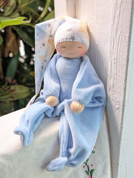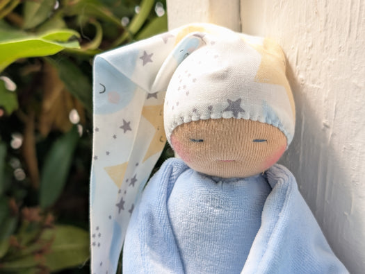 Wool is an incredible material for children, it is naturally antibacterial and will absorb the smell of home. Because of this, I think it's a sweet thing for mama or papa to 'wear' the doll for a few hours to imbue their scent on the doll, creating a comfort object for the child.