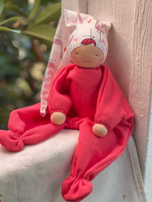 What a sweet doll to begin your life with. Lovingly hand stitched using all natural materials with a wool stuffed head. These dolls faces are intentionally soft and serene to reflect the dreamlike state of small children. As they grow older, the doll is an invitation to open ended play.