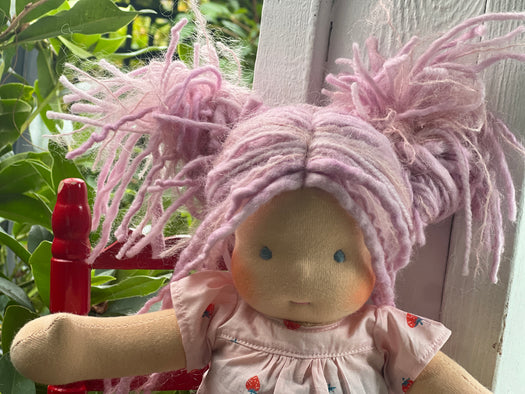 Our Cuddle Dolls are a smaller version of our Sitting Dolls. Their design makes them perfect for children who love to carry their doll everywhere — huggable, posable, and endlessly lovable. These are great 'first dolls' as their hair is a bit simpler with no hand spun art yarn in it and simple clothing for dressing and playing.