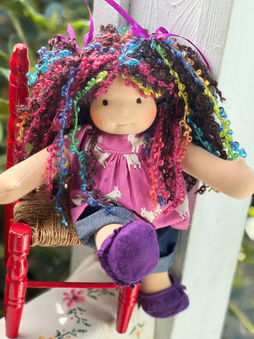 Our Cuddle Dolls are a smaller version of our Sitting Dolls. Their design makes them perfect for children who love to carry their doll everywhere — huggable, posable, and endlessly lovable. These are great 'first dolls' as their hair is a bit simpler with no hand spun art yarn in it and simple clothing for dressing and playing.