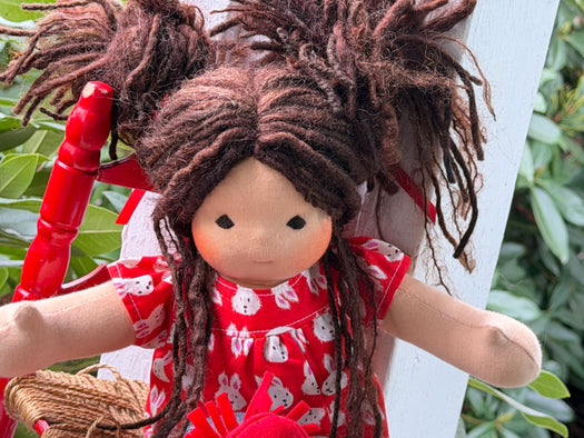 Our Cuddle Dolls are a smaller version of our Sitting Dolls. Their design makes them perfect for children who love to carry their doll everywhere — huggable, posable, and endlessly lovable. These are great 'first dolls' as their hair is a bit simpler with no hand spun art yarn in it and simple clothing for dressing and playing.