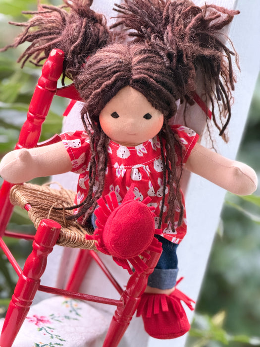 Meet Akia, a sweet heirloom Cuddle Doll with sunkissed cotton skin, a soft embroidered face, and hand-dyed wool and mohair yarn hair. She arrives in her pictured outfit, underpants, and felt wool shoes, ready for play and snuggles.
