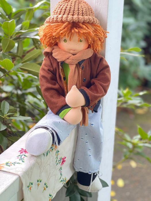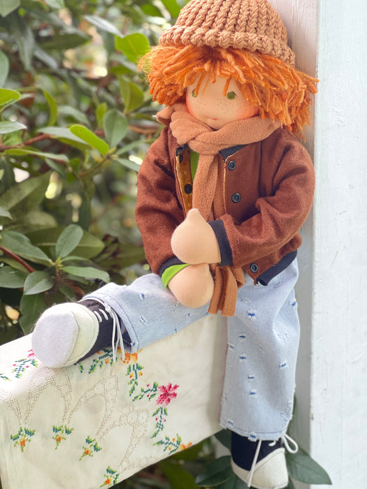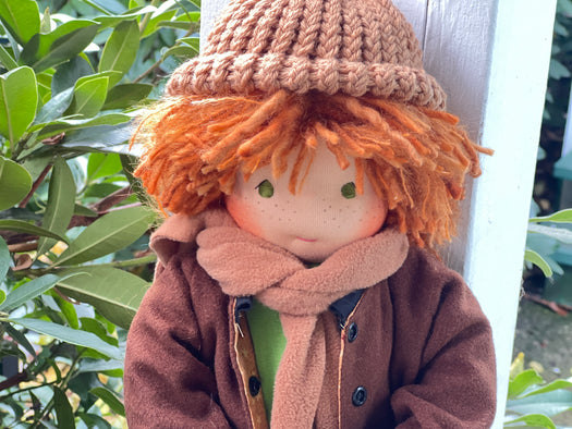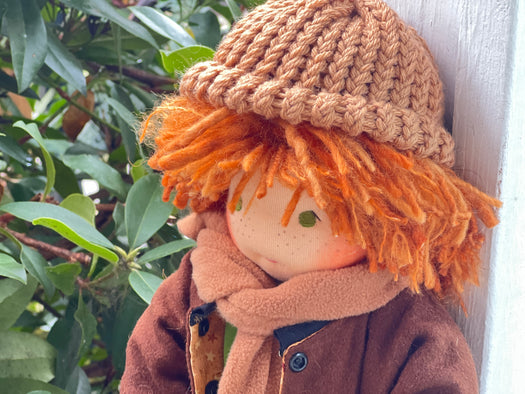 Meet Reuben, one of our cherished heirloom dolls, handmade with love and intention. His sunkissed cotton skin comes from specialty tricot sourced in the Netherlands, his eyes are delicately hand embroidered, and his hair is created from wool and mohair yarns many of them hand dyed, spun and hand stitched strand by strand. He’s stuffed with clean, carded Canadian wool, giving him a natural, comforting weight that children adore.