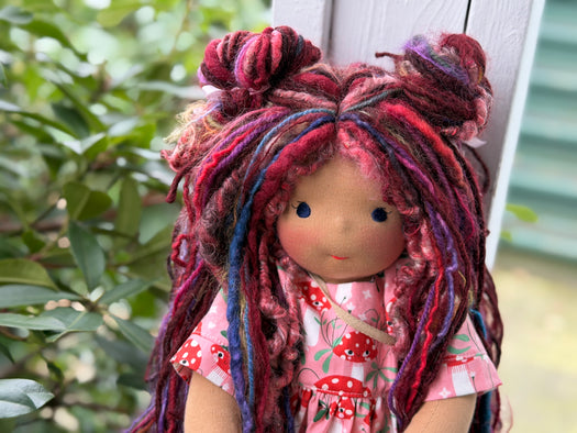 Meet Hailey, one of our cherished heirloom dolls, handmade with love and intention. Her sunkissed cotton skin comes from specialty tricot sourced in the Netherlands, her eyes are delicately hand embroidered, and her hair is created from wool and mohair yarns many of them hand dyed, spun and hand stitched strand by strand. She’s stuffed with clean, carded Canadian wool, giving her a natural, comforting weight that children adore.