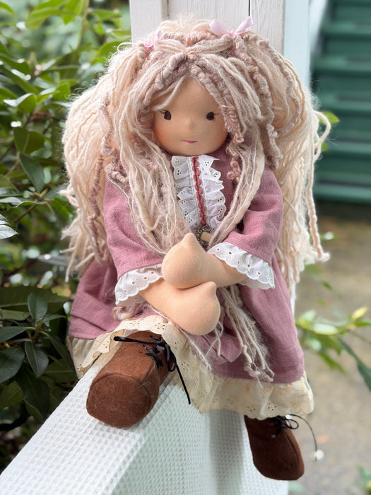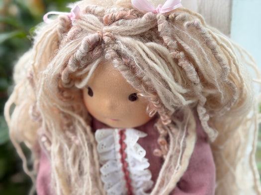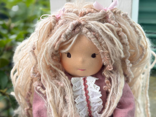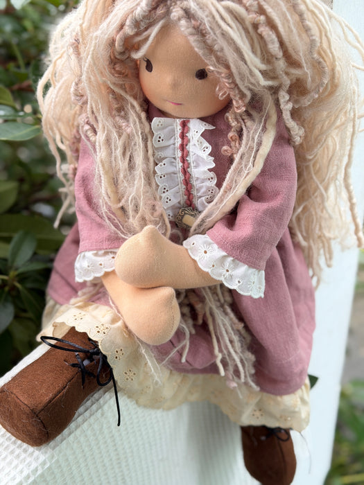 Meet Alma.., one of our cherished heirloom dolls, handmade with love and intention. Her sunkissed cotton skin comes from specialty tricot sourced in the Netherlands, her eyes are delicately hand embroidered, and her hair is created from wool and mohair yarns many of them hand dyed, spun and hand stitched strand by strand. She’s stuffed with clean, carded Canadian wool, giving her a natural, comforting weight that children adore.