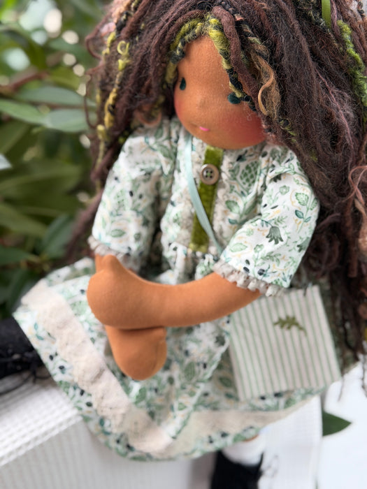 Meet Alma.., one of our cherished heirloom dolls, handmade with love and intention. Her sunkissed cotton skin comes from specialty tricot sourced in the Netherlands, her eyes are delicately hand embroidered, and her hair is created from wool and mohair yarns many of them hand dyed, spun and hand stitched strand by strand. She’s stuffed with clean, carded Canadian wool, giving her a natural, comforting weight that children adore.