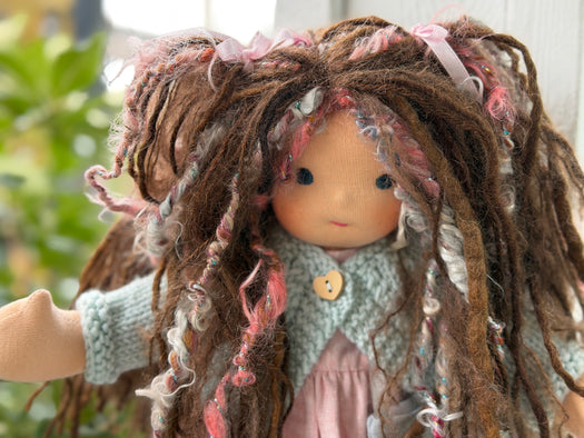 Made with natural fibres, each Little Friend has  hand-dyed hair yarn, a cotton knit “skin,” and is stuffed with West Coast wool for that comforting, natural weight children love. We’re happy to personalize your doll with freckles, a messy buns, or even a name change, just let us know!