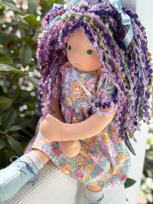 Meet Vera, one of our cherished heirloom dolls, handmade with love and intention. Her sunkissed cotton skin comes from specialty tricot sourced in the Netherlands, her eyes are delicately hand embroidered, and her hair is created from wool and mohair yarns many of them hand dyed, spun and hand stitched strand by strand. She’s stuffed with clean, carded Canadian wool, giving her a natural, comforting weight that children adore.