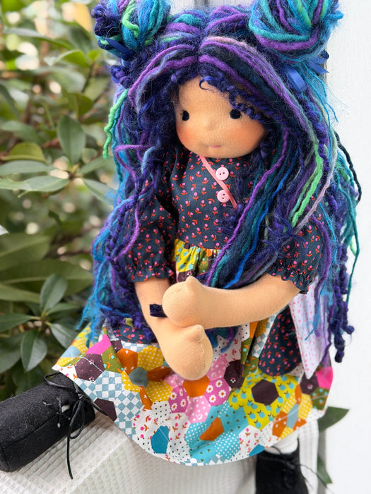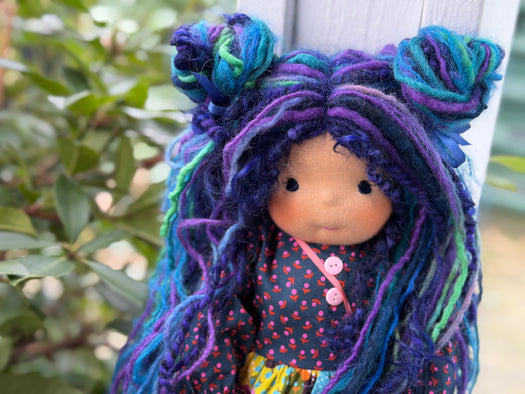 Meet Pansy, one of our cherished heirloom dolls, handmade with love and intention. Her sunkissed cotton skin comes from specialty tricot sourced in the Netherlands, her eyes are delicately hand embroidered, and her hair is created from wool and mohair yarns many of them hand dyed, spun and hand stitched strand by strand. She’s stuffed with clean, carded Canadian wool, giving her a natural, comforting weight that children adore.