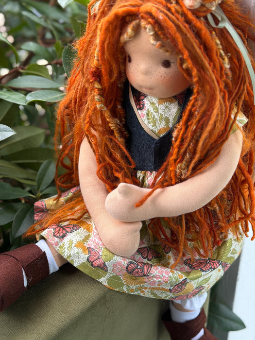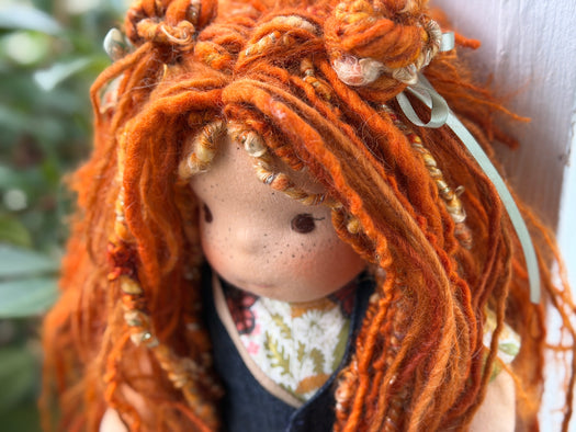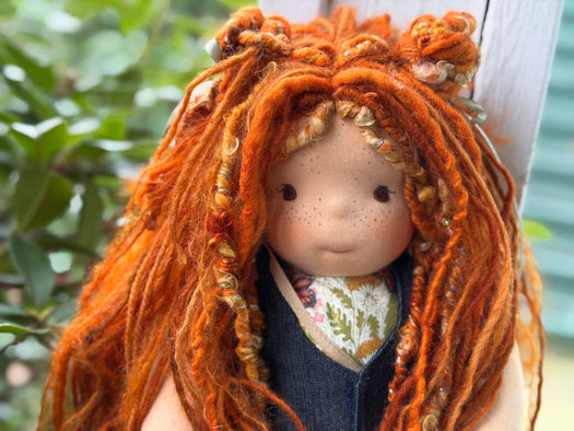 Meet Juniper, one of our cherished heirloom dolls, handmade with love and intention. Her sunkissed cotton skin comes from specialty tricot sourced in the Netherlands, her eyes are delicately hand embroidered, and her hair is created from wool and mohair yarns many of them hand dyed, spun and hand stitched strand by strand. She’s stuffed with clean, carded Canadian wool, giving her a natural, comforting weight that children adore.