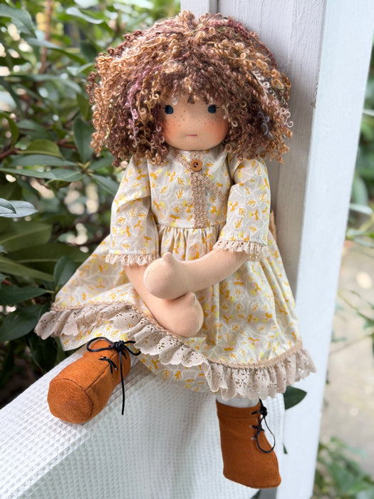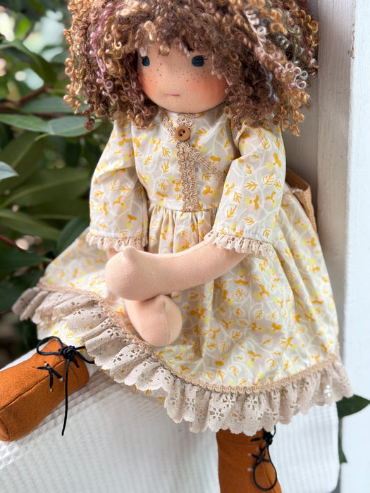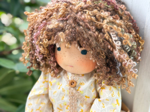 Meet Ulla.., one of our cherished heirloom dolls, handmade with love and intention. Her sunkissed cotton skin comes from specialty tricot sourced in the Netherlands, her eyes are delicately hand embroidered, and her hair is created from wool and mohair yarns many of them hand dyed, spun and hand stitched strand by strand. She’s stuffed with clean, carded Canadian wool, giving her a natural, comforting weight that children adore.