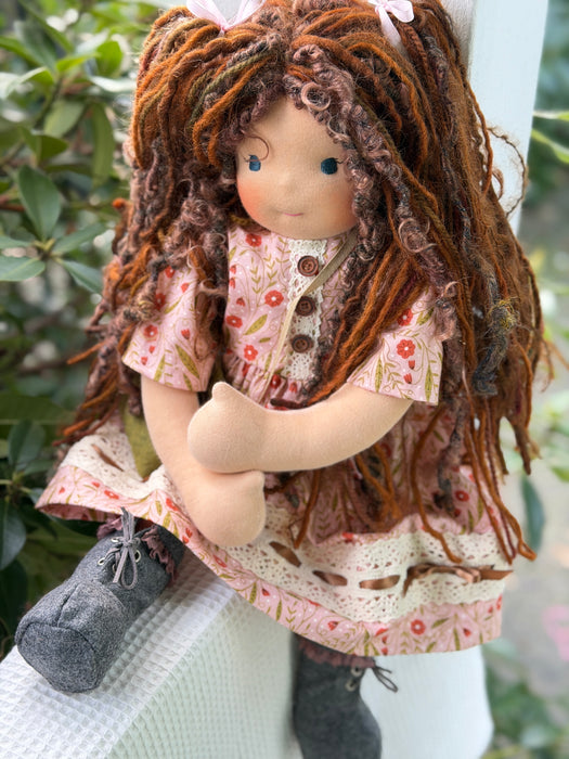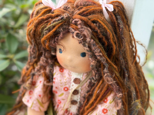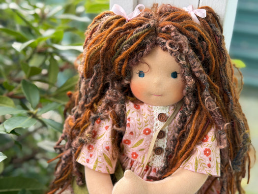 Meet Eloise, one of our cherished heirloom dolls, handmade with love and intention. Her sunkissed cotton skin comes from specialty tricot sourced in the Netherlands, her eyes are delicately hand embroidered, and her hair is created from wool and mohair yarns many of them hand dyed, spun and hand stitched strand by strand. She’s stuffed with clean, carded Canadian wool, giving her a natural, comforting weight that children adore.