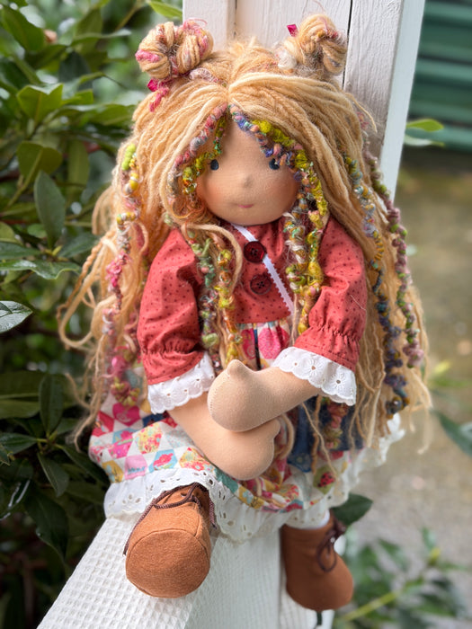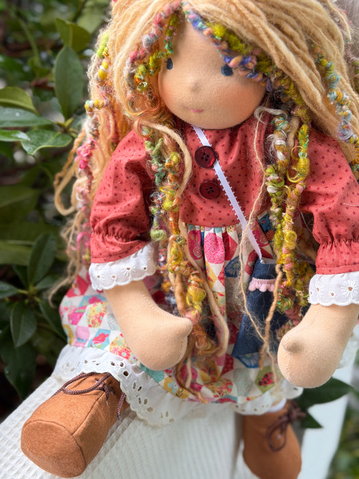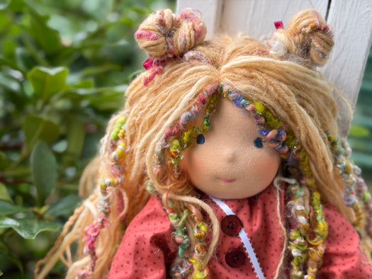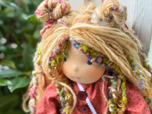 Meet [name], one of our cherished heirloom dolls, handmade with love and intention. Her sunkissed cotton skin comes from specialty tricot sourced in the Netherlands, her eyes are delicately hand embroidered, and her hair is created from wool and mohair yarns many of them hand dyed, spun and hand stitched strand by strand. She’s stuffed with clean, carded Canadian wool, giving her a natural, comforting weight that children adore.