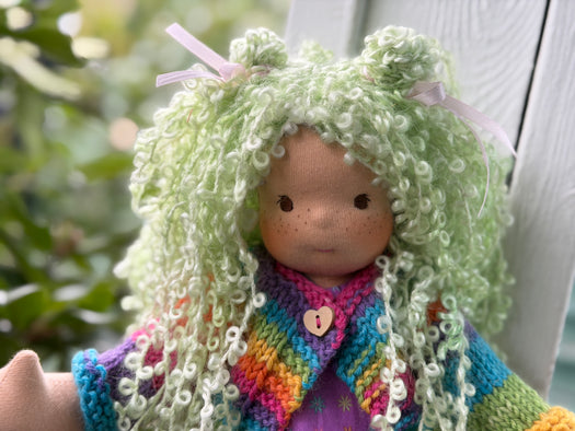 Made with natural fibres, each Little Friend has  hand-dyed hair yarn, a cotton knit “skin,” and is stuffed with West Coast wool for that comforting, natural weight children love. We’re happy to personalize your doll with freckles, a messy buns, or even a name change, just let us know!