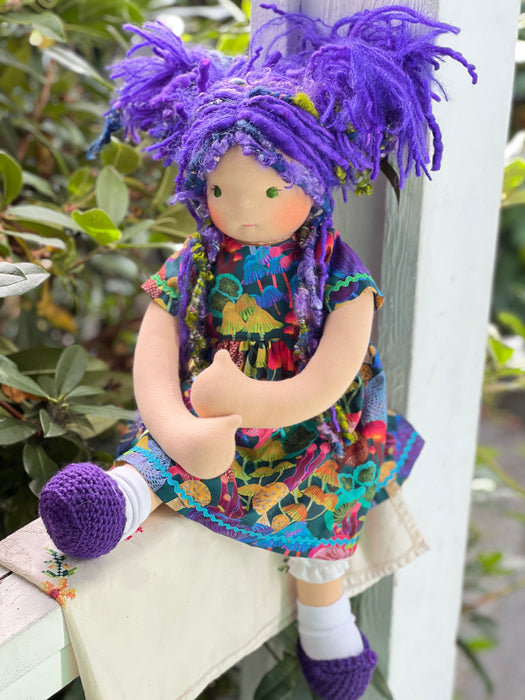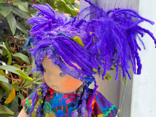 Meet Lavender, one of our cherished heirloom dolls, handmade with love and intention. Her sunkissed cotton skin comes from specialty tricot sourced in the Netherlands, her eyes are delicately hand embroidered, and her hair is created from wool and mohair yarns many of them hand dyed, spun and hand stitched strand by strand. She’s stuffed with clean, carded Canadian wool, giving her a natural, comforting weight that children adore.