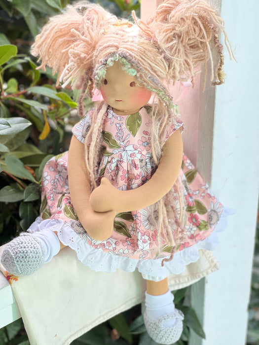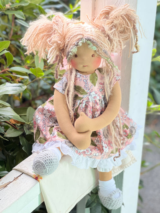 Meet Ophelia, one of our cherished heirloom dolls, handmade with love and intention. Her mocha cotton skin comes from specialty tricot sourced in the Netherlands, her eyes are delicately hand embroidered, and her hair is created from wool and mohair yarns many of them hand dyed, spun and hand stitched strand by strand. She’s stuffed with clean, carded Canadian wool, giving her a natural, comforting weight that children adore.