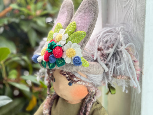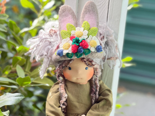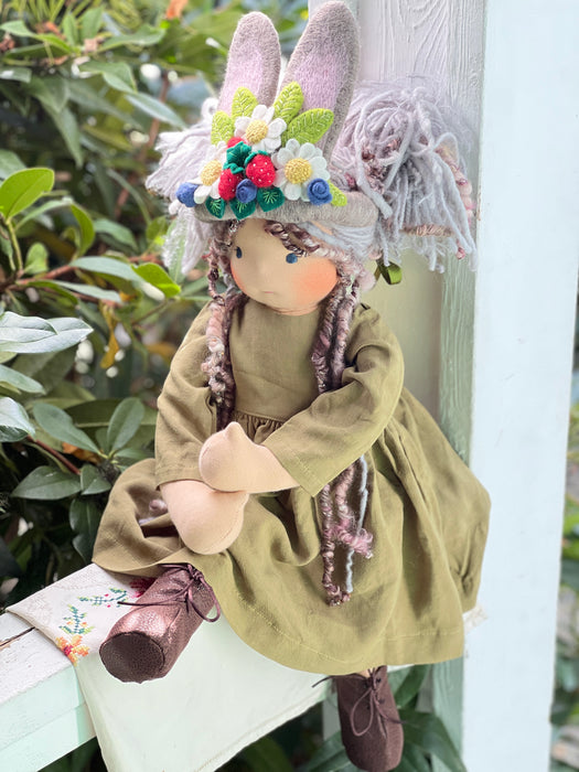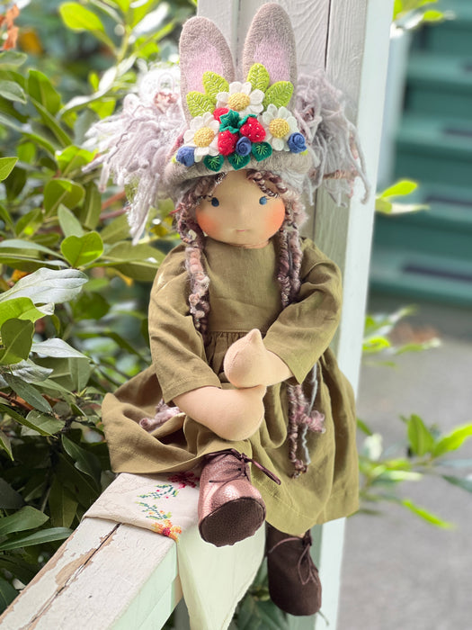 Meet Velvatine , one of our cherished heirloom dolls, handmade with love and intention. Her sunkissed cotton skin comes from specialty tricot sourced in the Netherlands, her eyes are delicately hand embroidered, and her hair is created from wool and mohair yarns many of them hand dyed, spun and hand stitched strand by strand. She’s stuffed with clean, carded Canadian wool, giving her a natural, comforting weight that children adore.