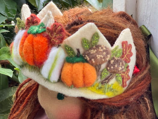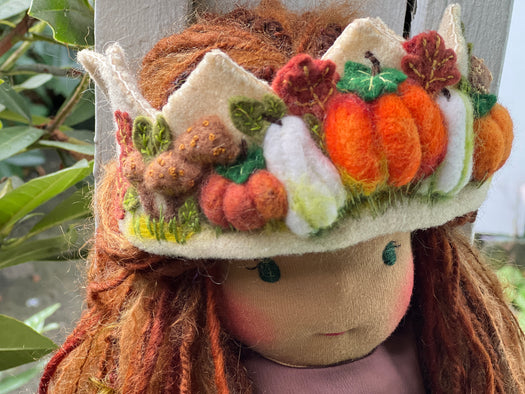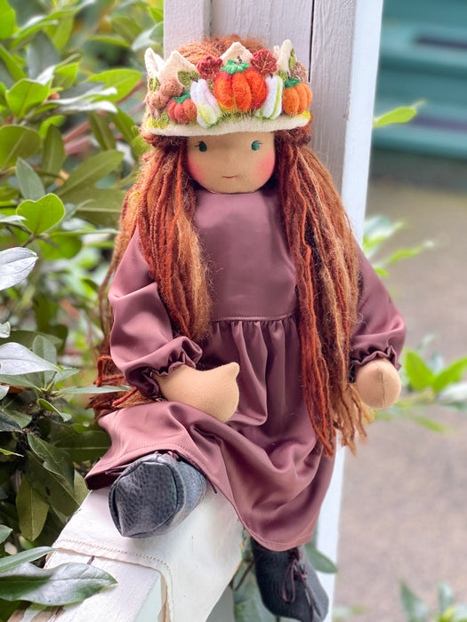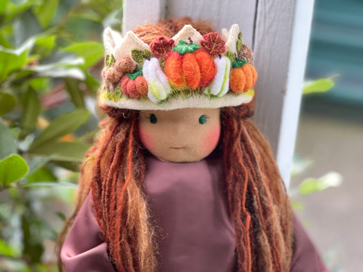Meet ....., one of our cherished heirloom dolls, handmade with love and intention. Her sunkissed cotton skin comes from specialty tricot sourced in the Netherlands, her eyes are delicately hand embroidered, and her hair is created from wool and mohair yarns many of them hand dyed, spun and hand stitched strand by strand. She’s stuffed with clean, carded Canadian wool, giving her a natural, comforting weight that children adore.