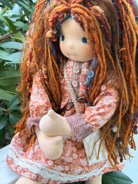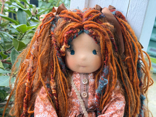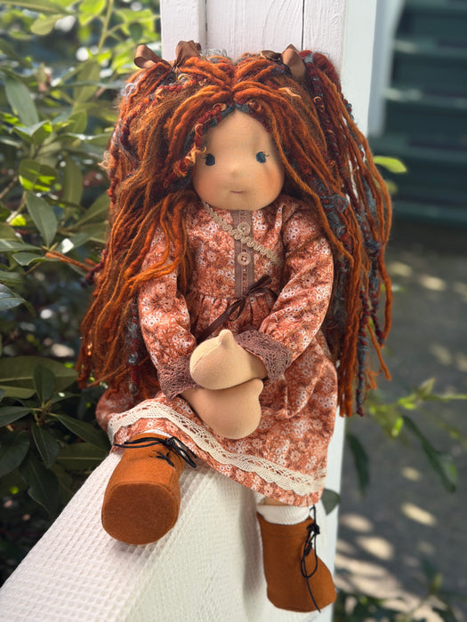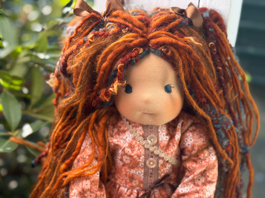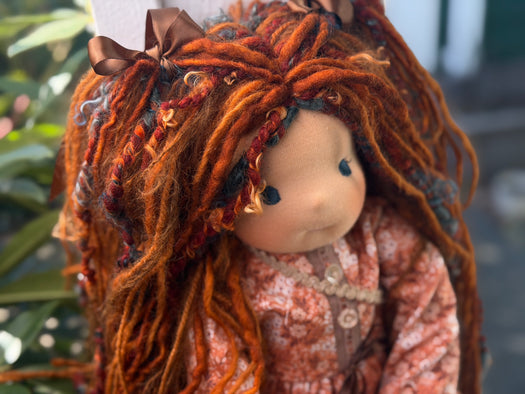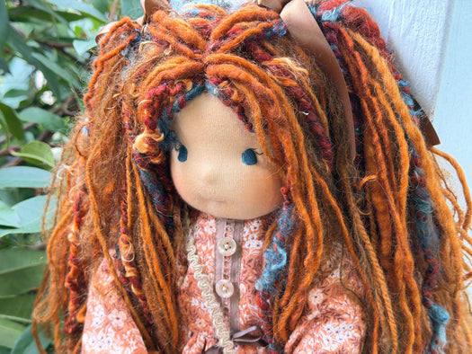 Meet one of our cherished heirloom dolls, handmade with love and intention. Her sunkissed cotton skin comes from specialty tricot sourced in the Netherlands, her eyes are delicately hand embroidered, and her hair is created from wool and mohair yarns many of them hand dyed, spun and hand stitched strand by strand. She’s stuffed with clean, carded Canadian wool, giving her a natural, comforting weight that children adore.