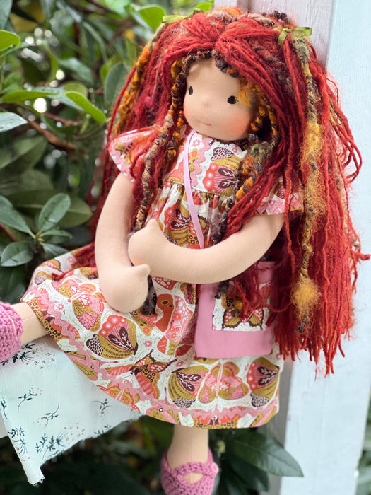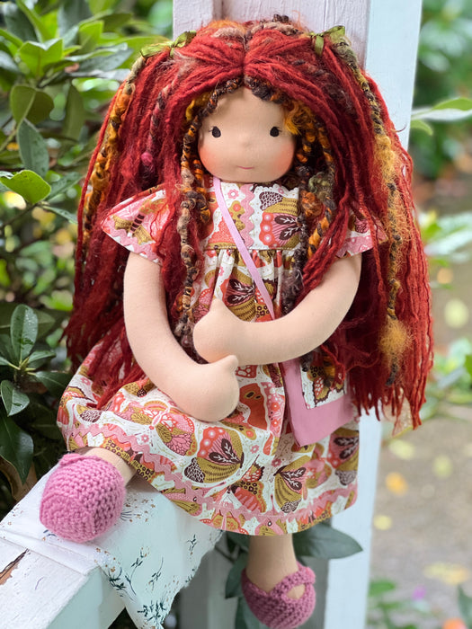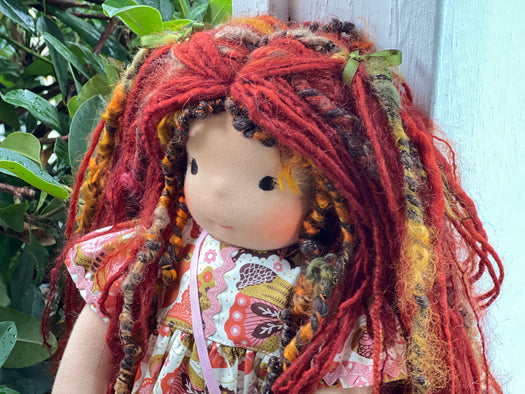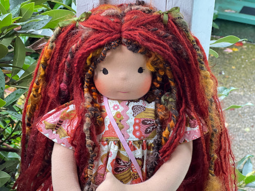 Meet Rowan, one of our cherished heirloom dolls, handmade with love and intention. Her sunkissed cotton skin comes from specialty tricot sourced in the Netherlands, her eyes are delicately hand embroidered, and her hair is created from wool and mohair yarns many of them hand dyed, spun and hand stitched strand by strand. She’s stuffed with clean, carded Canadian wool, giving her a natural, comforting weight that children adore.