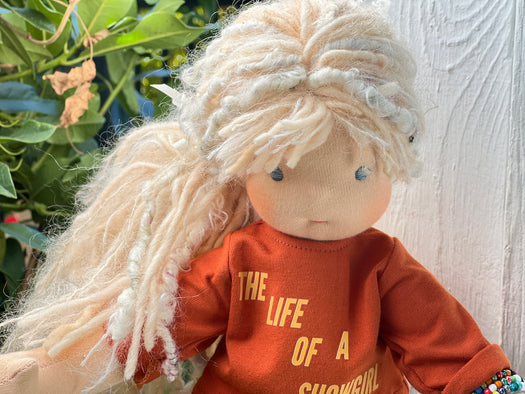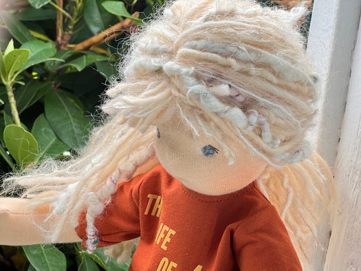 Made with natural fibres, each Little Friend has  hand-dyed hair yarn, a cotton knit “skin,” and is stuffed with West Coast wool for that comforting, natural weight children love. We’re happy to personalize your doll with freckles, a messy buns, or even a name change, just let us know!