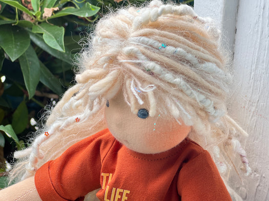 Made with natural fibres, each Little Friend has  hand-dyed hair yarn, a cotton knit “skin,” and is stuffed with West Coast wool for that comforting, natural weight children love. We’re happy to personalize your doll with freckles, a messy buns, or even a name change, just let us know!