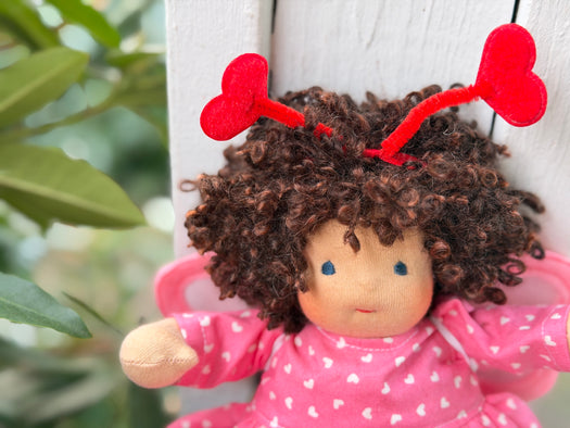I am excited to offer these little cuties up for adoption today! Measuring about 6–7" long, our Piccolina Baby Dolls are handmade with cotton knit and stuffed with cozy West Coast wool for that soft, natural feel children love. Their hair is crafted from wool and mohair yarns, their sweet faces are hand-embroidered, and each one comes wearing a tiny diaper and matching outfits.