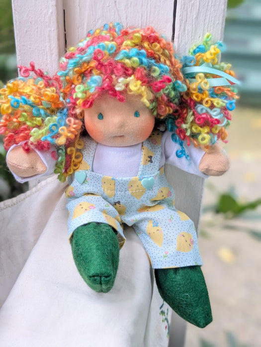 I am excited to offer these little cuties up for adoption today! Measuring about 6–7" long, our Piccolina Baby Dolls are handmade with cotton knit and stuffed with cozy West Coast wool for that soft, natural feel children love. Their hair is crafted from wool and mohair yarns, their sweet faces are hand-embroidered, and each one comes wearing a tiny diaper and matching outfits.