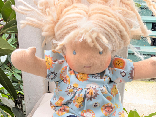 What is this little bundle of sweetness? A Piccolina! Our smallest heirloom doll, measuring about 9" of pure cuteness. Though tiny, Piccolinas are made with the same natural materials and love as our larger dolls — cotton knit, Canadian wool, and all the heart our team can stitch in.