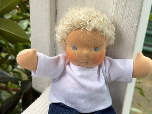 What is this little bundle of sweetness? A Piccolina! Our smallest heirloom doll, measuring about 9" of pure cuteness. Though tiny, Piccolinas are made with the same natural materials and love as our larger dolls — cotton knit, Canadian wool, and all the heart our team can stitch in.