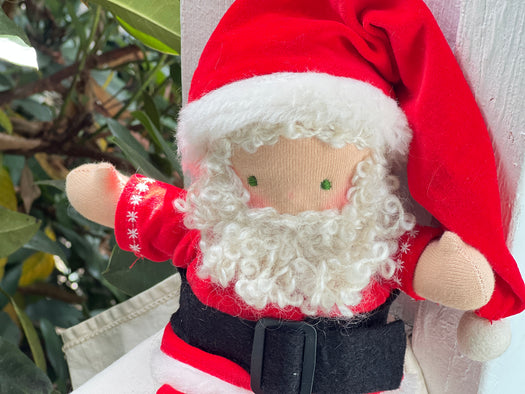 What is this little bundle of sweetness? A Piccolina! Our smallest heirloom doll, measuring about 9" of pure cuteness. Though tiny, Piccolinas are made with the same natural materials and love as our larger dolls — cotton knit, Canadian wool, and all the heart our team can stitch in.