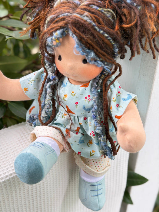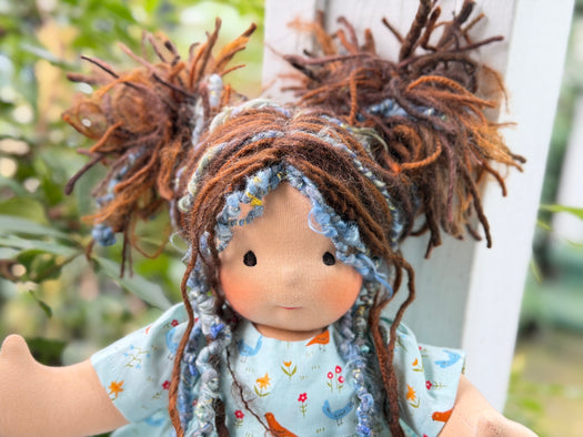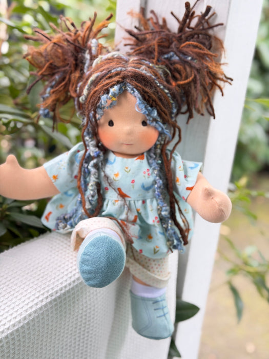 Meet Victoria, one of our treasured heirloom Sitting Dolls. She has sunkissed cotton skin, soft embroidered eyes, and beautiful wool/mohair yarn hair. Dressed in her pictured outfit, underpants, and wool felt shoes, she’s ready for endless adventures.