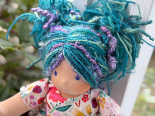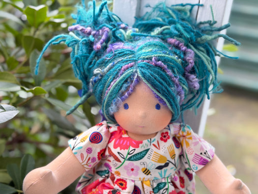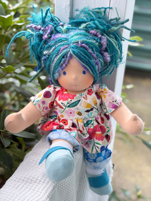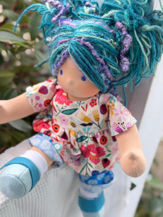 Meet Artemis, one of our treasured heirloom Sitting Dolls. She has sunkissed cotton skin, soft embroidered eyes, and beautiful wool/mohair yarn hair. Dressed in her pictured outfit, underpants, and wool felt shoes, she's ready for endless adventures.