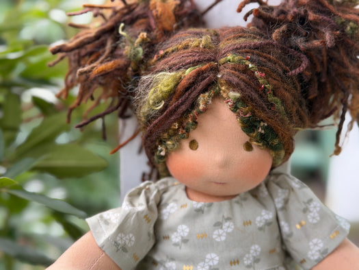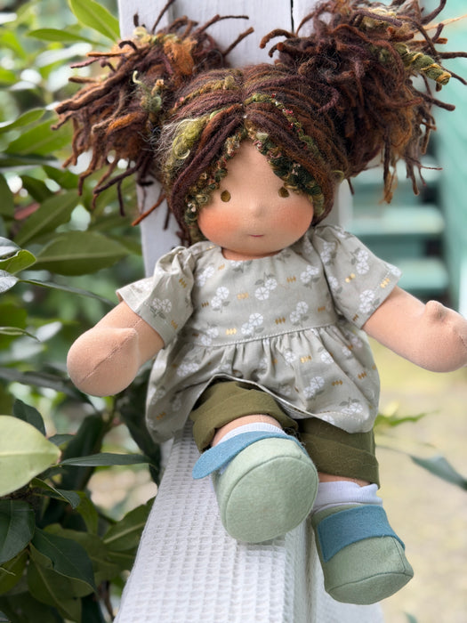 Meet Calliope, one of our treasured heirloom Sitting Dolls. She has sunkissed cotton skin, soft embroidered eyes, and beautiful wool/mohair yarn hair. Dressed in her pictured outfit, underpants, and wool felt shoes, she’s ready for endless adventures.