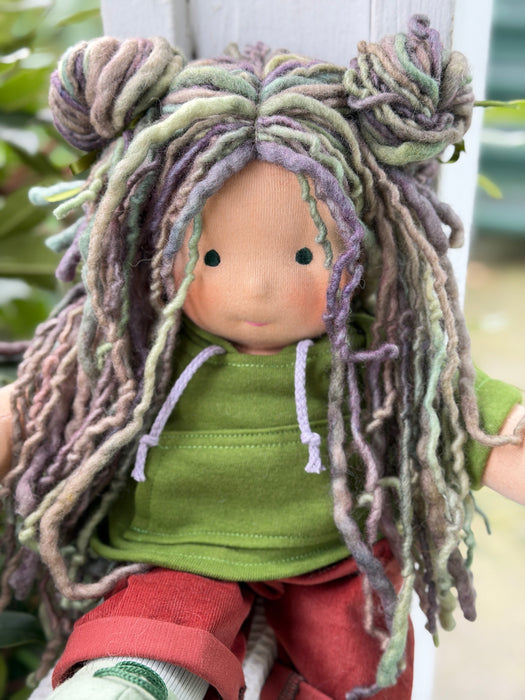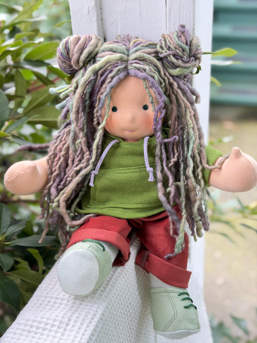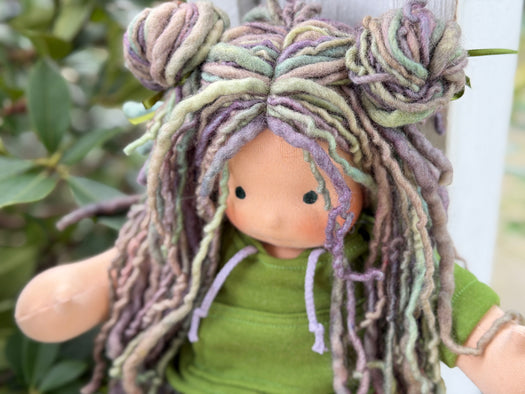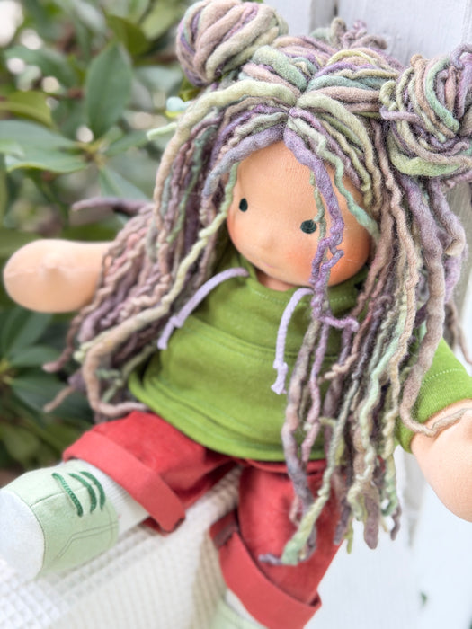 Meet Lux, one of our treasured heirloom Sitting Dolls. She has sunkissed cotton skin, soft embroidered eyes, and beautiful wool/mohair yarn hair. Dressed in her pictured outfit, underpants, and wool felt shoes, she’s ready for endless adventures.
