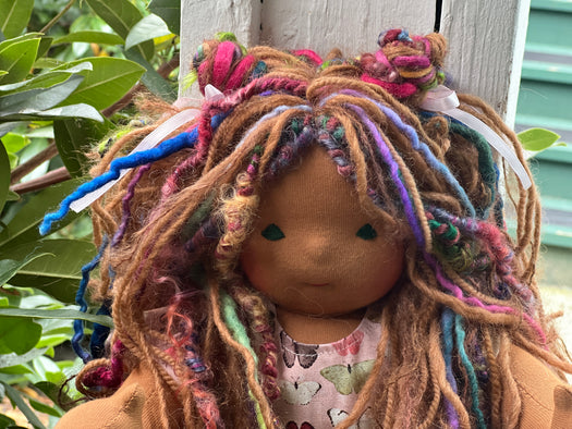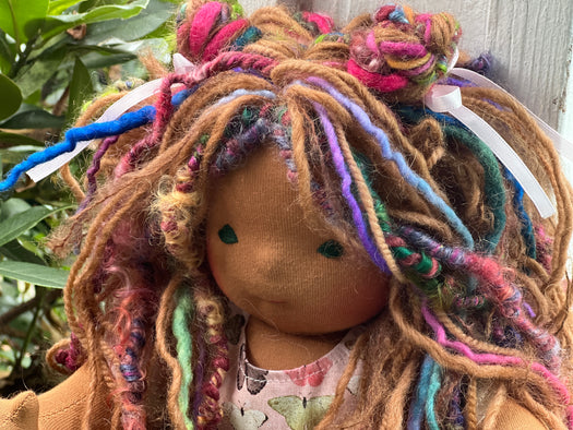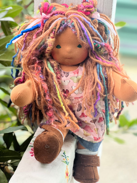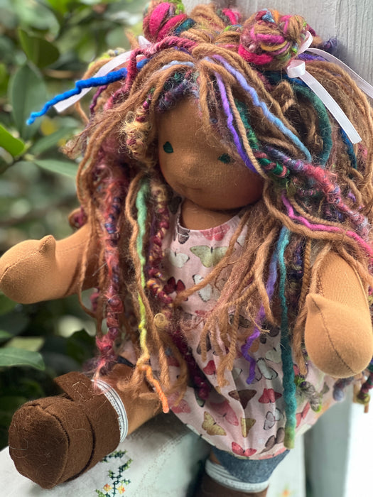 Meet Zara], one of our treasured heirloom Sitting Dolls. She has mocha LE cotton skin, soft embroidered eyes, and beautiful wool/mohair yarn hair. Dressed in her pictured outfit, underpants, and wool felt shoes, she’s ready for endless adventures.