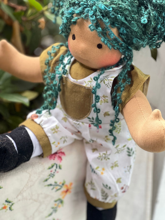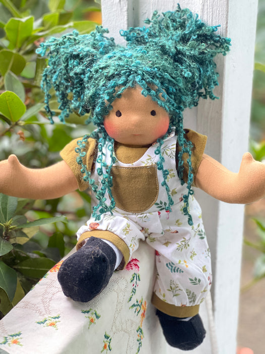 Meet Eden, one of our treasured heirloom Sitting Dolls. She has mocha cotton skin, soft embroidered eyes, and beautiful wool/mohair yarn hair. Dressed in her pictured outfit, underpants, and wool felt shoes, she’s ready for endless adventures.