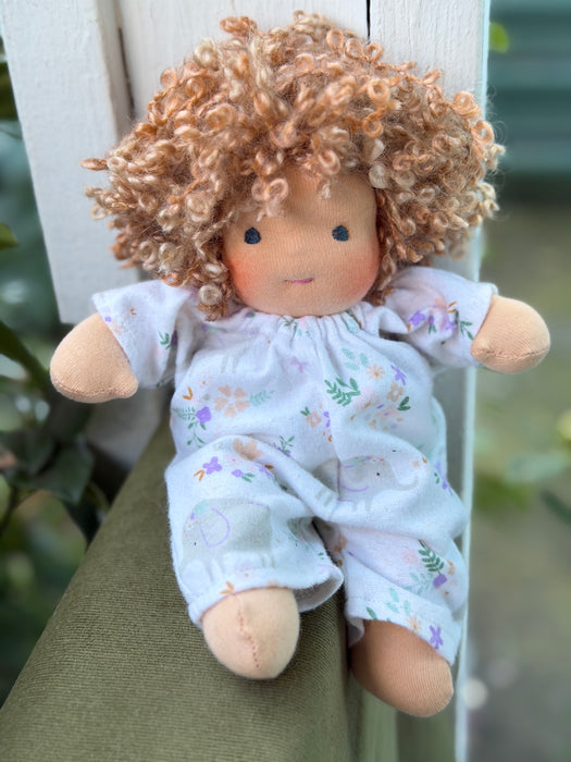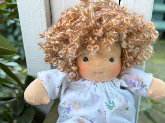 I am excited to offer these little cuties up for adoption today! Measuring about 6–7" long, our Piccolina Baby Dolls are handmade with cotton knit and stuffed with cozy West Coast wool for that soft, natural feel children love. Their hair is crafted from wool and mohair yarns, their sweet faces are hand-embroidered, and each one comes wearing a tiny diaper and matching outfits.