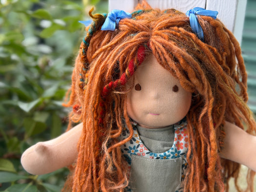 Meet Abigail, one of our treasured heirloom Classic Dolls. She has sunkissed cotton skin, hand embroidered face, and hair made from hand-dyed wool and mohair yarns. She arrives in her pictured outfit, underpants, and wool felt shoes, ready to become a lifelong companion.