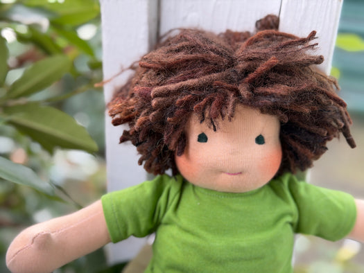 Our Cuddle Dolls are a smaller version of our Sitting Dolls. Their design makes them perfect for children who love to carry their doll everywhere — huggable, posable, and endlessly lovable. These are great 'first dolls' as their hair is a bit simpler with no hand spun art yarn in it and simple clothing for dressing and playing.