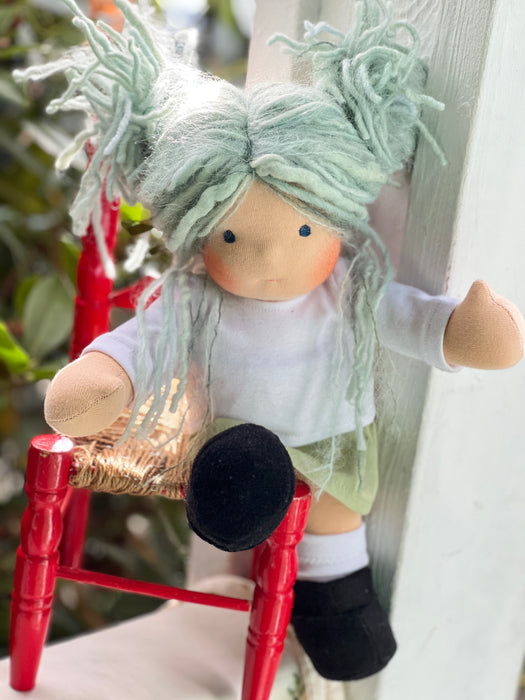 Meet Chloe, a sweet heirloom Cuddle Doll with sunkissed cotton skin, a soft embroidered face, and hand-dyed wool and mohair yarn hair. She arrives in her pictured outfit, underpants, and felt wool shoes, ready for play and snuggles.