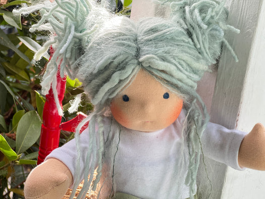 Our Cuddle Dolls are a smaller version of our Sitting Dolls. Their design makes them perfect for children who love to carry their doll everywhere — huggable, posable, and endlessly lovable. These are great 'first dolls' as their hair is a bit simpler with no hand spun art yarn in it and simple clothing for dressing and playing.