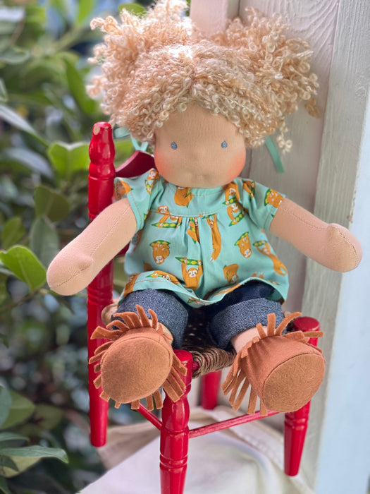 Meet Lou Lou, a sweet heirloom Cuddle Doll with sunkissed cotton skin, a soft embroidered face, and hand-dyed wool and mohair yarn hair. She arrives in her pictured outfit, underpants, and felt wool shoes, ready for play and snuggles.