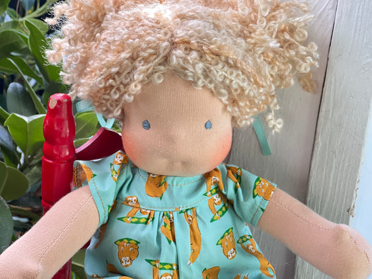 Our Cuddle Dolls are a smaller version of our Sitting Dolls. Their design makes them perfect for children who love to carry their doll everywhere — huggable, posable, and endlessly lovable. These are great 'first dolls' as their hair is a bit simpler with no hand spun art yarn in it and simple clothing for dressing and playing.