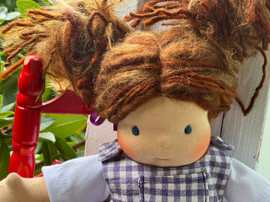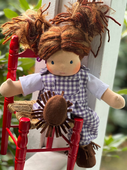 Our Cuddle Dolls are a smaller version of our Sitting Dolls. Their design makes them perfect for children who love to carry their doll everywhere — huggable, posable, and endlessly lovable. These are great 'first dolls' as their hair is a bit simpler with no hand spun art yarn in it and simple clothing for dressing and playing.