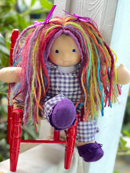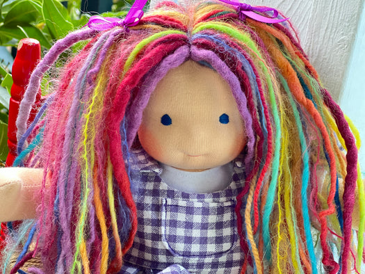 Our Cuddle Dolls are a smaller version of our Sitting Dolls. Their design makes them perfect for children who love to carry their doll everywhere — huggable, posable, and endlessly lovable. These are great 'first dolls' as their hair is a bit simpler with no hand spun art yarn in it and simple clothing for dressing and playing.