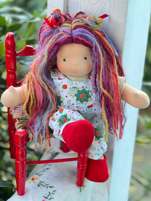 Our Cuddle Dolls are a smaller version of our Sitting Dolls. Their design makes them perfect for children who love to carry their doll everywhere — huggable, posable, and endlessly lovable. These are great 'first dolls' as their hair is a bit simpler with no hand spun art yarn in it and simple clothing for dressing and playing.