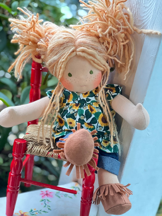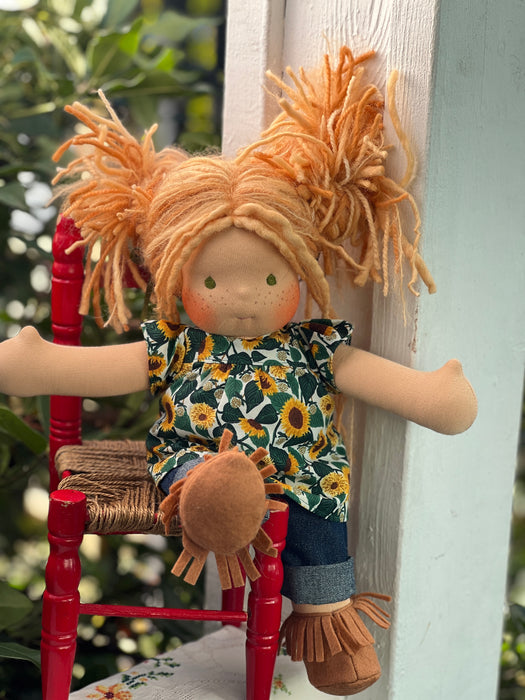 Meet Sasha a sweet heirloom Cuddle Doll with sunkissed cotton skin, a soft embroidered face, and hand-dyed wool and mohair yarn hair. She arrives in her pictured outfit, underpants, and felt wool shoes, ready for play and snuggles.
