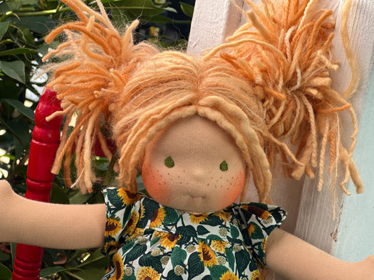 Our Cuddle Dolls are a smaller version of our Sitting Dolls. Their design makes them perfect for children who love to carry their doll everywhere — huggable, posable, and endlessly lovable. These are great 'first dolls' as their hair is a bit simpler with no hand spun art yarn in it and simple clothing for dressing and playing.