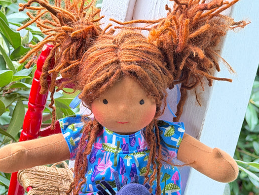 Our Cuddle Dolls are a smaller version of our Sitting Dolls. Their design makes them perfect for children who love to carry their doll everywhere — huggable, posable, and endlessly lovable. These are great 'first dolls' as their hair is a bit simpler with no hand spun art yarn in it and simple clothing for dressing and playing.